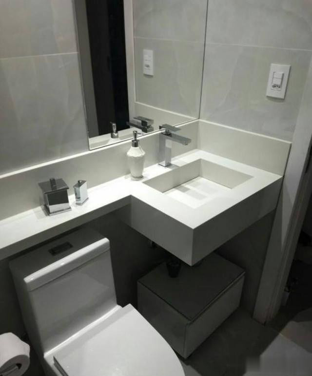 你知谈吗,把洗手台沿墙拉长,致使作念成L形、P形策划,能让台面面积翻倍。