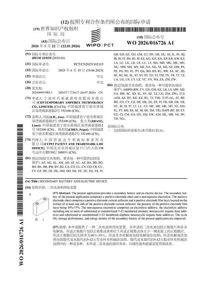 证券之星音讯,凭证企查查数据露馅宁德期间(300750)公布了一项外洋专利肯求,专利名为“二次电板和用电安装”,专利肯求号为PCT/CN2025/102115,外洋公布日为2026年1月22日。